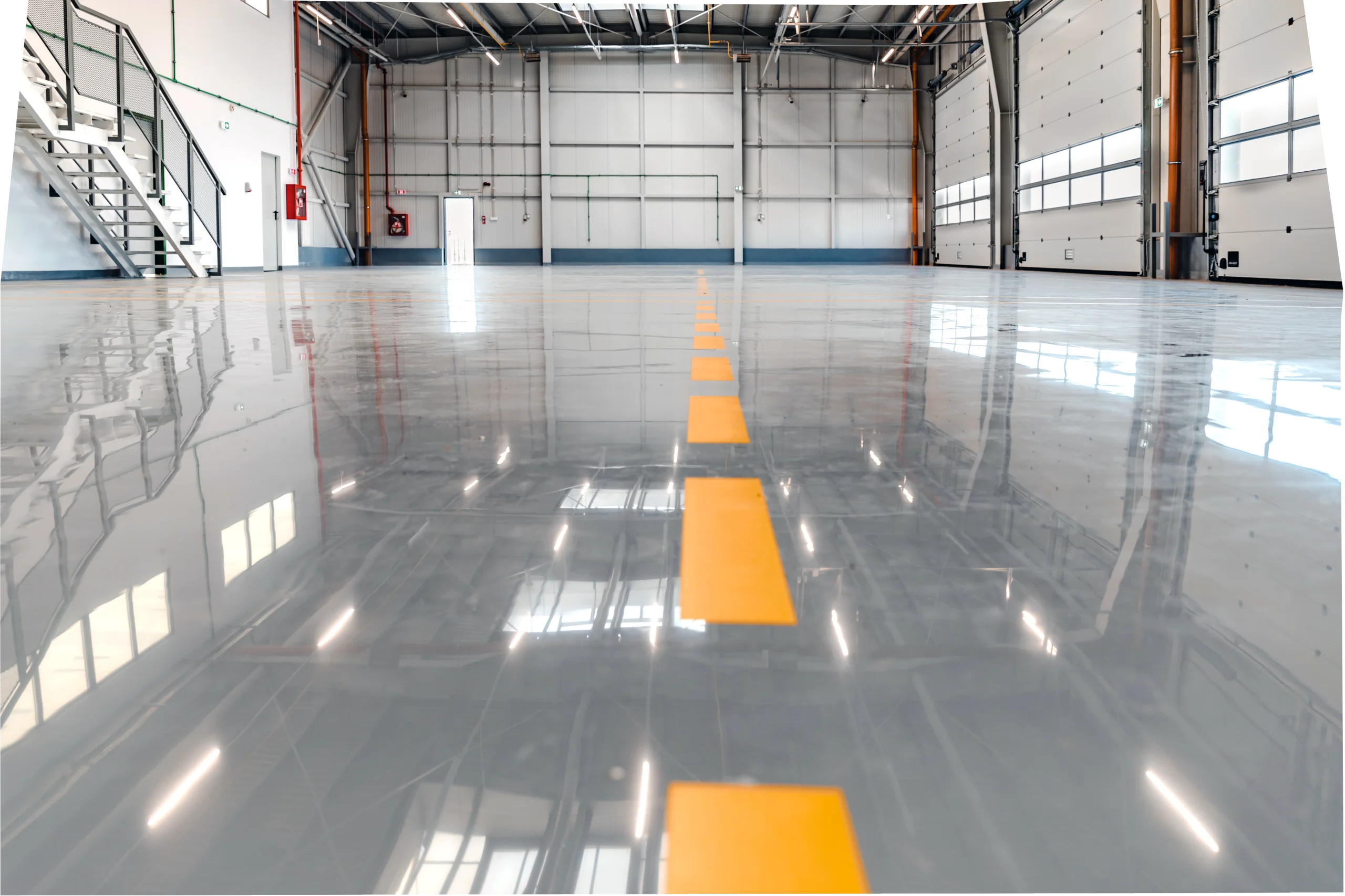 Такое покрытие предотвращает образование бетонной пыли, укрепляет основание и упрощает уход. Оно особенно актуально для складов, логистических центров и промышленных зон с высокой нагрузкой.